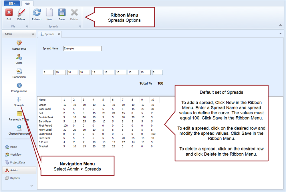 Select in the Navigation Menu to view the default set of spread curves, add a new curve, as well as edit or delete an existing curve. All ProjStream software tools and projects share the list of spread curves.