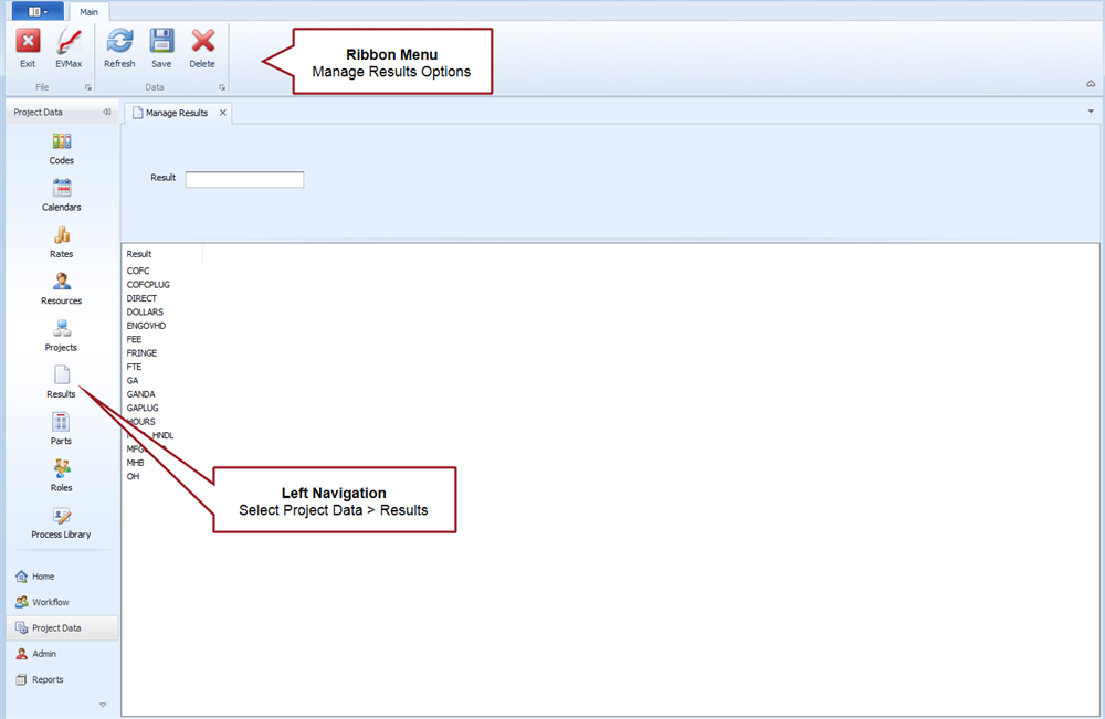 Results are the named base values you enter as well as the calculated values you want to identify for estimating, planning, and reporting. This is a simple list of result names that are used in the rate structures, resource structures, ProjStream software tool configuration settings, main windows, and reporting. All ProjStream software tools and projects share this result name list.