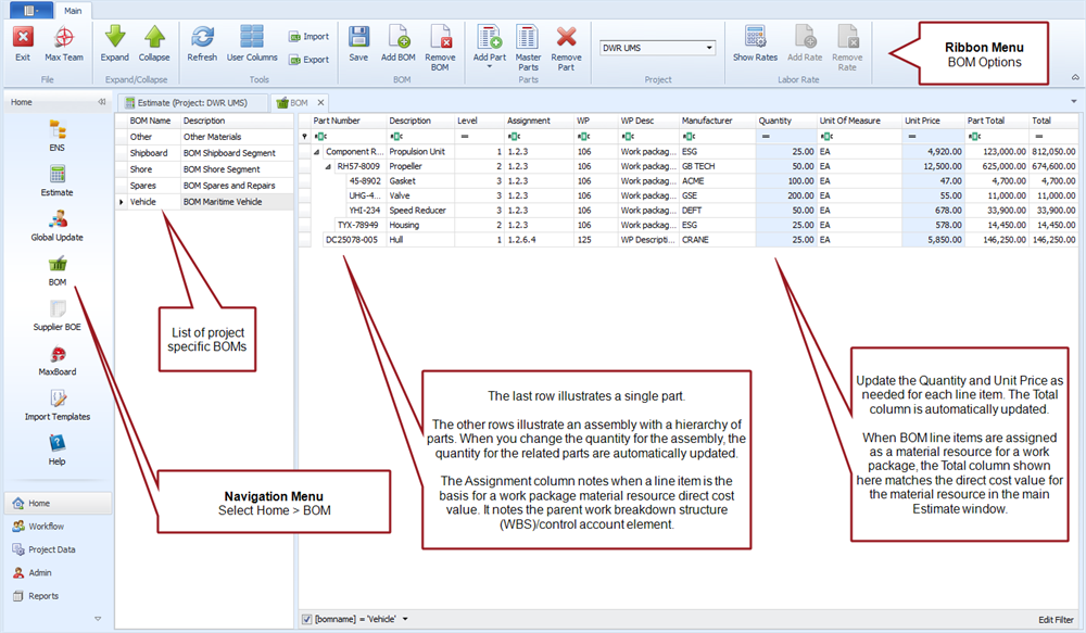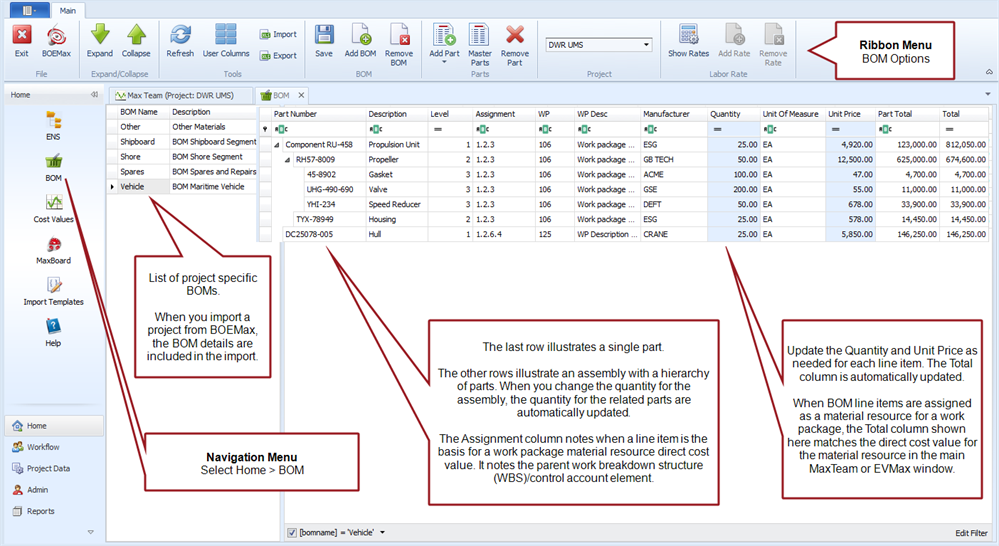Bills of material (BOMs) are project specific and can be shared between BOEMax and MaxTeam or EVMax. You can create one or more BOMs for a project to match how you want to organize and maintain the data. A BOM can be made up of a list of parts and assemblies identified with a name, description, manufacturer, unit of measure, and quantity. An assembly groups a set of individual parts into a hierarchical structure to create a larger material component. Changing the assembly quantity automatically determines the number of individual parts.