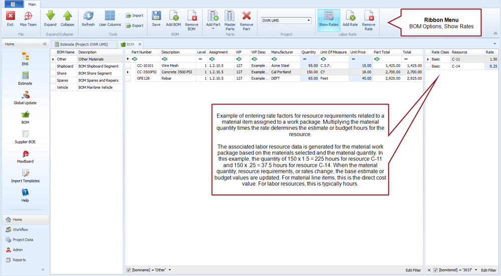 If you intend to share the project BOMs between BOEMax and MaxTeam or EVMax for the execution phase of the project, recommend creating the BOMs in BOEMax. When you import an existing project from BOEMax to create the project in MaxTeam or EVMax, the project BOMs are included in the import process. You can then use the BOMs to status work packages assigned the Material assumption type and Quantities earned value technique. You can also enter the actual quantities and unit price for material variance analysis. When you are using the BOM for material take off quantities with labor resources and rate factors associated with the material item, recommend using the Earning Rules EV Technique because you are mixing the elements of cost (labor and material) in the same work package.