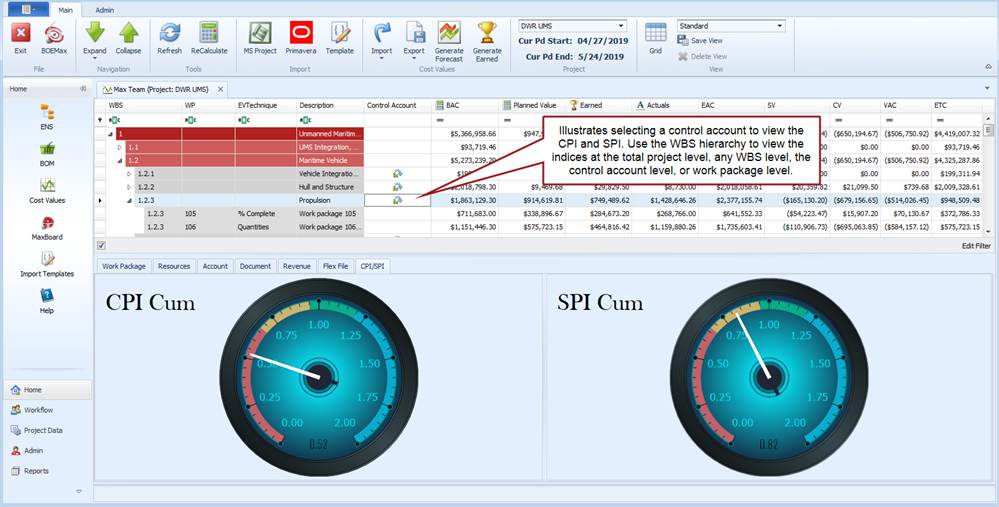 You can use the CPI/SPI tab at any time to quickly assess the cumulative to date cost performance index (CPI) and schedule performance index (SPI) at the total project level, selected level of the work breakdown structure (WBS), or work package level. The tab displays a dashboard view with a visual gauge of the indices with red, yellow, and green bands for the metrics. A visual representation is often useful for quickly determining work elements that require additional management attention.