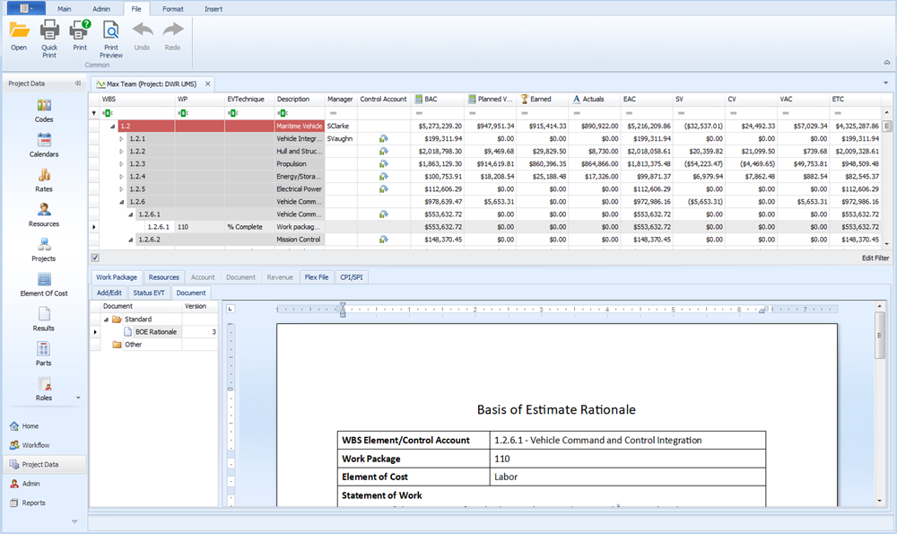 Standard documents are common documents you define as part of your estimating or planning process. For example, your process may have a defined standard format for documenting the scope of work or basis of estimate rationale. Standard documents can be assigned to the account (work breakdown structure (WBS)/control account) or work package level for use in the main EVMax window. You can add other user defined documents at either level in the main EVMax window that are specific to an account (WBS element or control account) or work package. EVMax automatically increments the version number when the document content is updated.