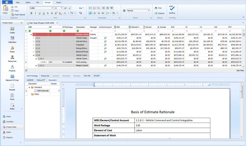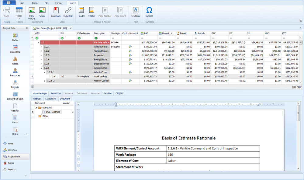 EVMax is designed for you enter documentation along with the time phased cost data in the main EVMax window. The Document function is a text view similar to Word. You can enter or paste text, format the content, add headers and footers, insert tables or images, and print the content. As an option, you can use an existing Word or text document as a template for the documentation.