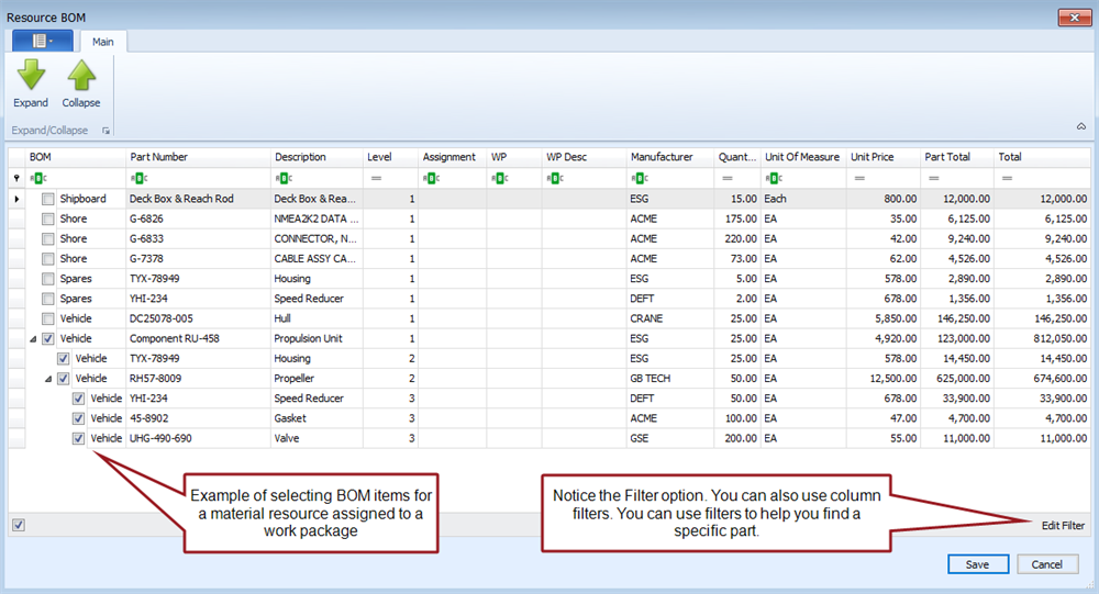 - Material. Use this option when you have defined one or more bills of material (BOMs) for the project. See Bill of Material (BOM). You use the Resource BOM window to select the applicable materials for the work package. The BOM identifies the work elements where the materials are assigned.