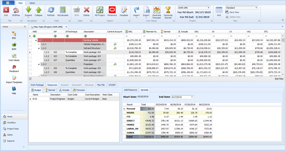 The assigned rate structure and resource structure determines how other results are automatically calculated from the base values you enter. For example, when you enter resource labor hours for a work package, the direct cost and indirect costs such as labor overheads and G&A overheads are calculated for you. As you enter the base values and other results are calculated for you, the values in the total budget column are automatically updated for the applicable WBS hierarchy rows so you can easily assess the total cost estimate or budget for the work elements as well as the total project. Should you make changes to the rates or resource result calculations, you can recalculate the values as needed. For example, you may need to update the rates twice a year to reflect the current forward pricing overhead rates.