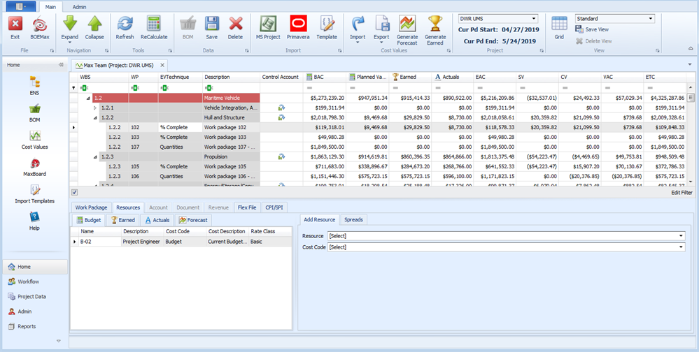 When you have implemented the change control workflow process on your project, do not change your budget data in EVMax. This includes work packages, resource assignments, and time phased values. The change control process assumes you are using BOEMax to maintain a historical archive of the budget changes. All changes, including updates for rolling wave planning, are first modeled in BOEMax and once approved, the changes are merged into EVMax to maintain the budget data. The shared workflow functions ensure all changes to the baseline data are automatically documented using the source data in BOEMax and EVMax.