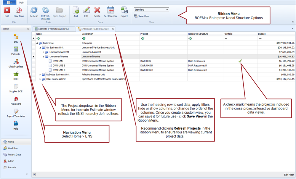 The ENS is common to all projects within a given ProjStream tool (BOEMax, MaxTeam or EVMax). The data columns and options available are dependent on which ProjStream tool you are using. For example, the ENS in BOEMax includes a total Budget column for proposal projects. The ENS in MaxTeam or EVMax includes additional columns for active or completed projects such as Budget at Completion, Planned Value (budget), Earned, Actual, Estimate at Completion (EAC), Estimate to Complete (ETC), and variance calculations.
