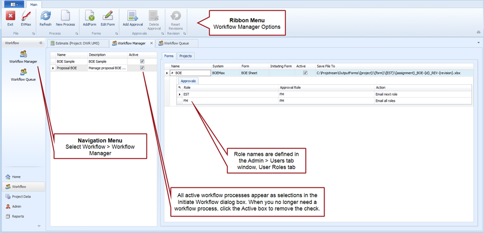 A workflow process consists of a sequence of one or more workflow forms such as a basis of estimate (BOE), baseline change request (BCR), or work authorization. Each form is assigned a sequence of one or more approvals associated with a named workflow user role.